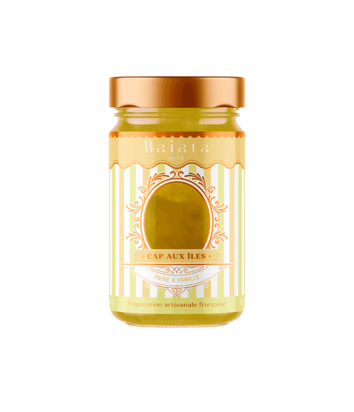 Zutatenliste: Birne, Rohrzucker, Zitronensaft, Vanilleextrakt. Hergestellt aus 67 g Früchten pro 100 g Endprodukt. Hergestellt in unserem Atelier in der Altstadt von Nizza und von Hand zubereitet.