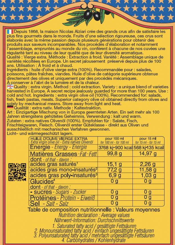 Harvest of the year. For over 100 years, this great vintage of olive oil is the fruit of a subtle blend of identical, exceptional varieties harvested mures. Originating from the best European land, this vintage, which has made the fame of the house, possesses a unique fruity taste and releases aromas of an incomparable sweetness. Ideal for your raw vegetables, the finesse of this oil will also enchant your cooked dishes. (Acidity below 0.3 °)